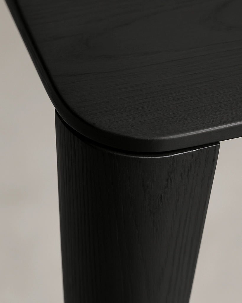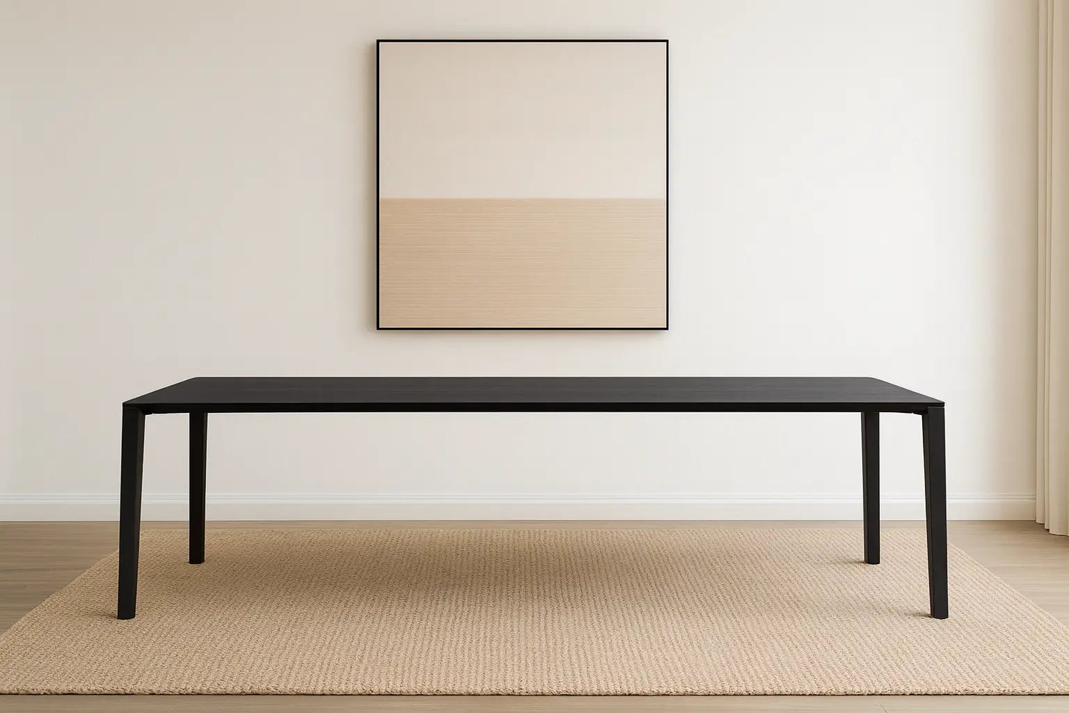 Der ARCO Esstisch in schwarz matt lackierter Eiche ist ein Meisterwerk europäischer Möbelkunst. Mit seiner schwebenden Tischplatte, den sanften Rundungen und der makellosen Verarbeitung vereint er Stärke, Harmonie und Raffinesse.