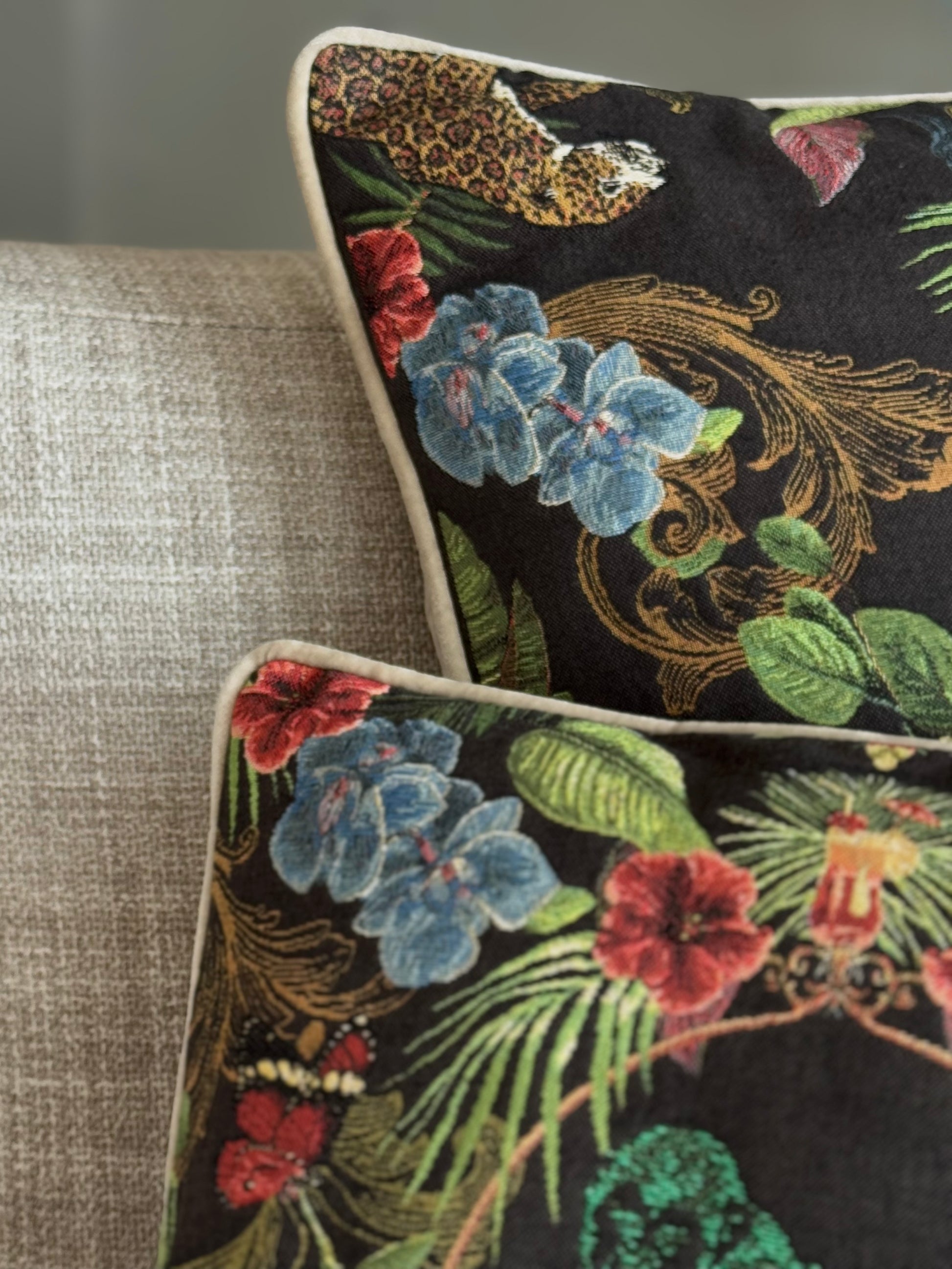 Gefertigt aus feinstem, in Belgien gewebtem Gobelin zeigt dieses exklusive Design ein kunstvolles Dschungelmotiv mit einem grünen Affen im Zentrum – umrahmt von exotischen Blättern, Blüten und Leoparden.