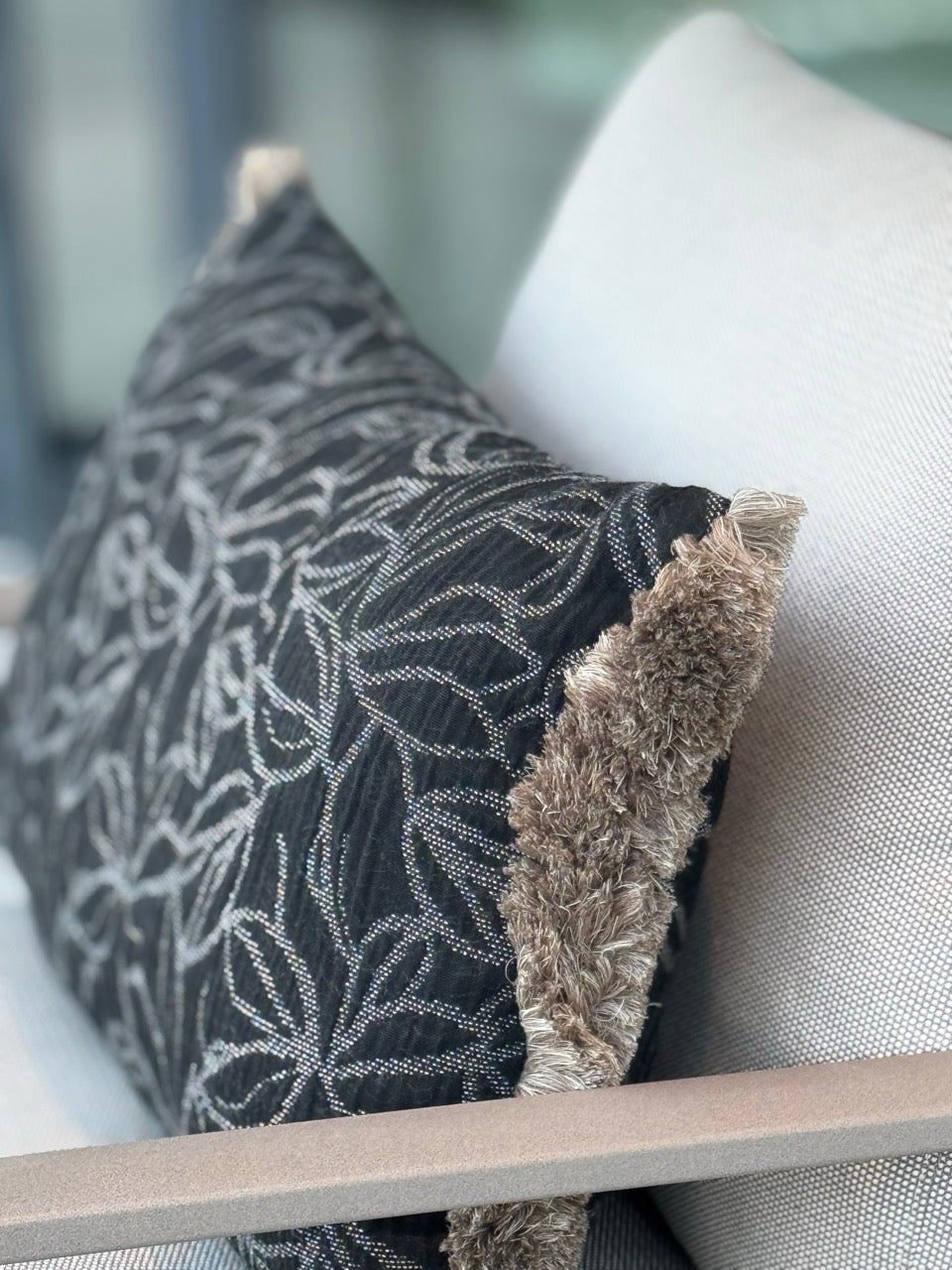 Eine handgefertigte Fransenborte in Beige setzt einen warmen, natürlichen Akzent und unterstreicht den handwerklichen Anspruch des Designs. Das Zusammenspiel aus dunklem Grundton und feiner Struktur sorgt für eine ruhige, grafische Wirkung.