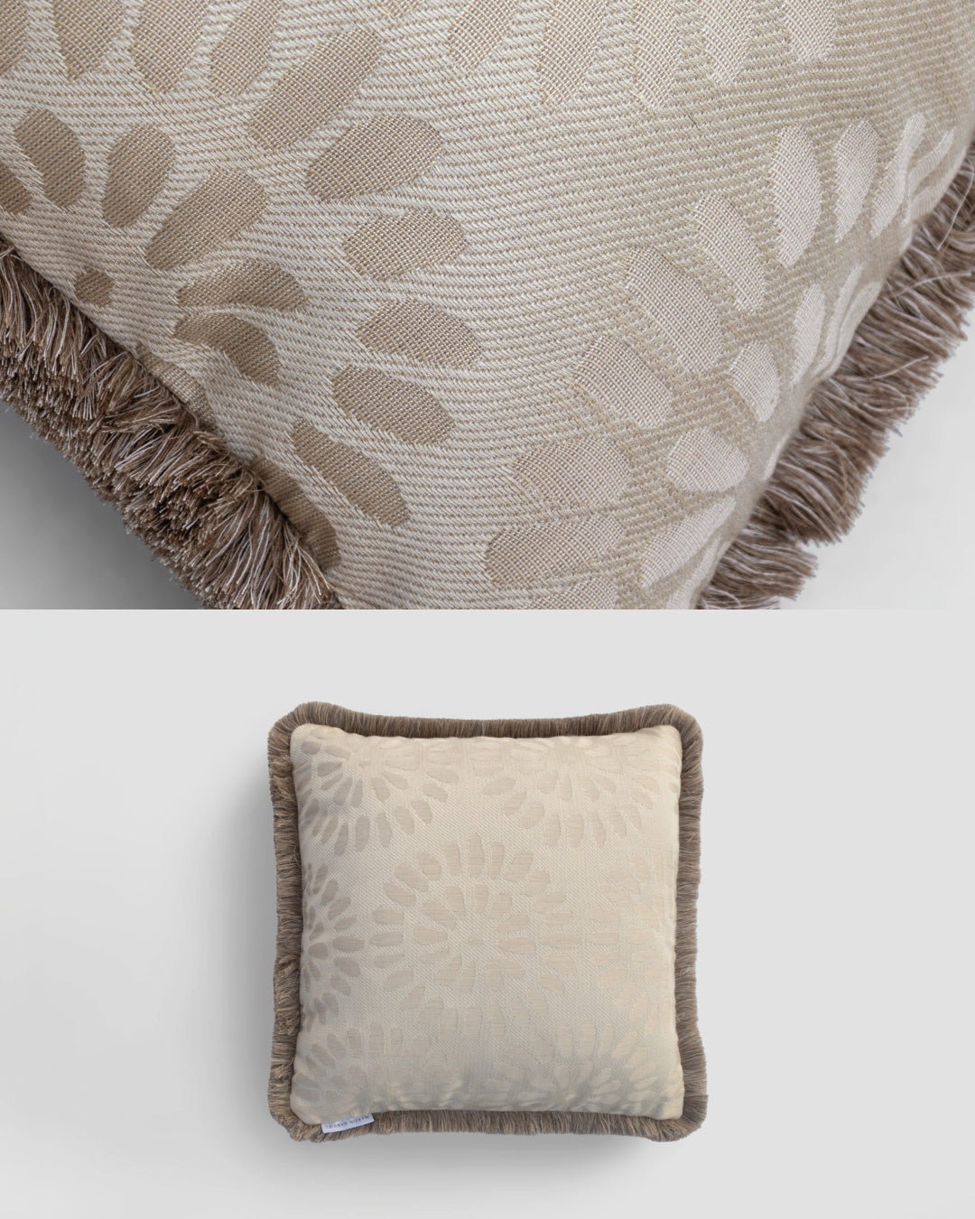Le coussin d'extérieur Morkote de Martin Gabriel allie élégance intemporelle et matériaux d'extérieur de haute qualité. Ses franges tout autour et son délicat motif floral beige ton sur ton lui confèrent une touche subtile et élégante, idéale pour la terrasse, le balcon ou le salon de jardin.