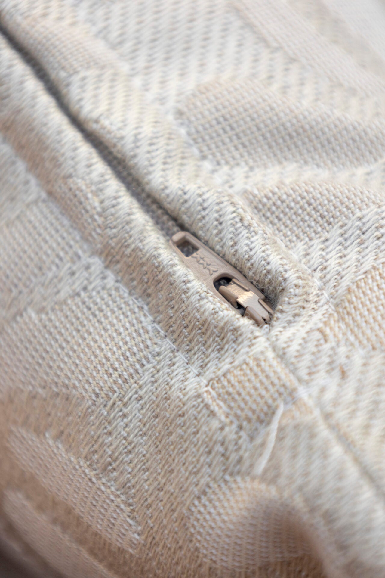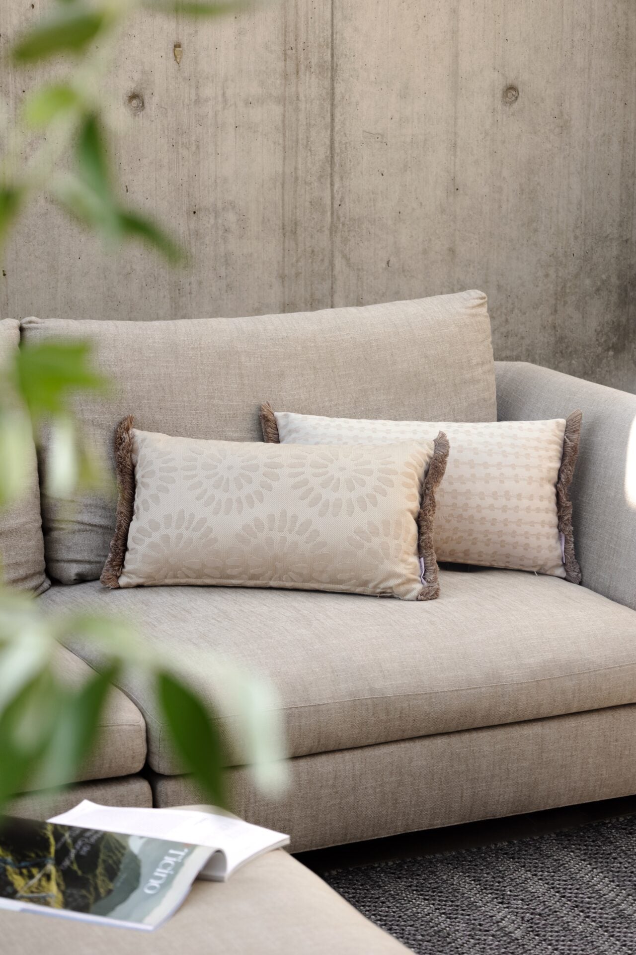 L'élégant ton beige-gris et sa texture fine confèrent à ce coussin une allure raffinée et discrète qui reflète délicatement la lumière. La bordure à franges marron clair, douce, artisanale et subtile, complète le design avec une sophistication naturelle. Pour ceux qui apprécient les détails.