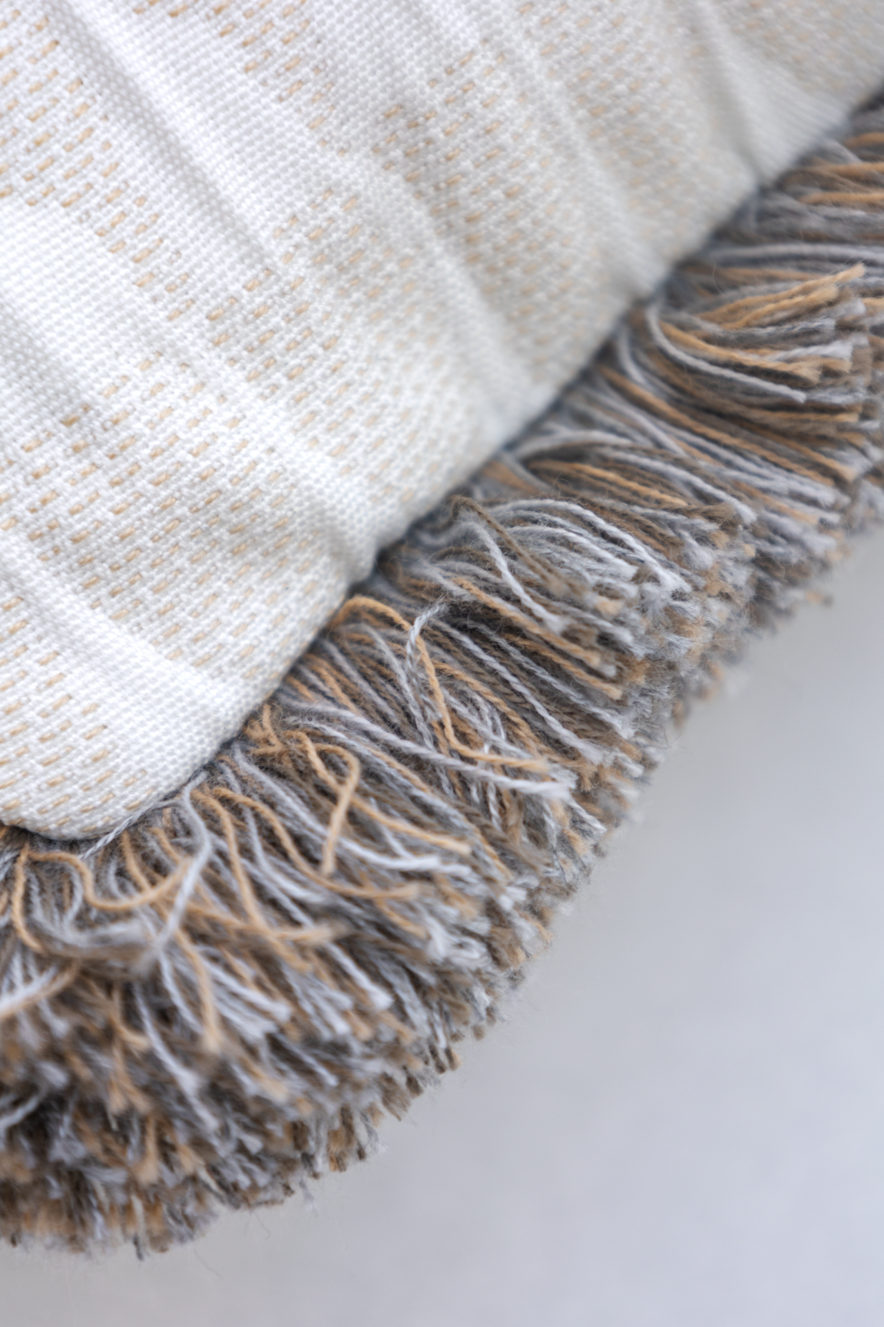 Sa texture fine et ses franges confèrent à ce coussin un caractère méditerranéen sophistiqué. Confectionné à partir de fils sélectionnés d'Italie, de Belgique et d'Angleterre, il est conçu avec précision pour une stabilité de forme et une qualité tactile incomparable.