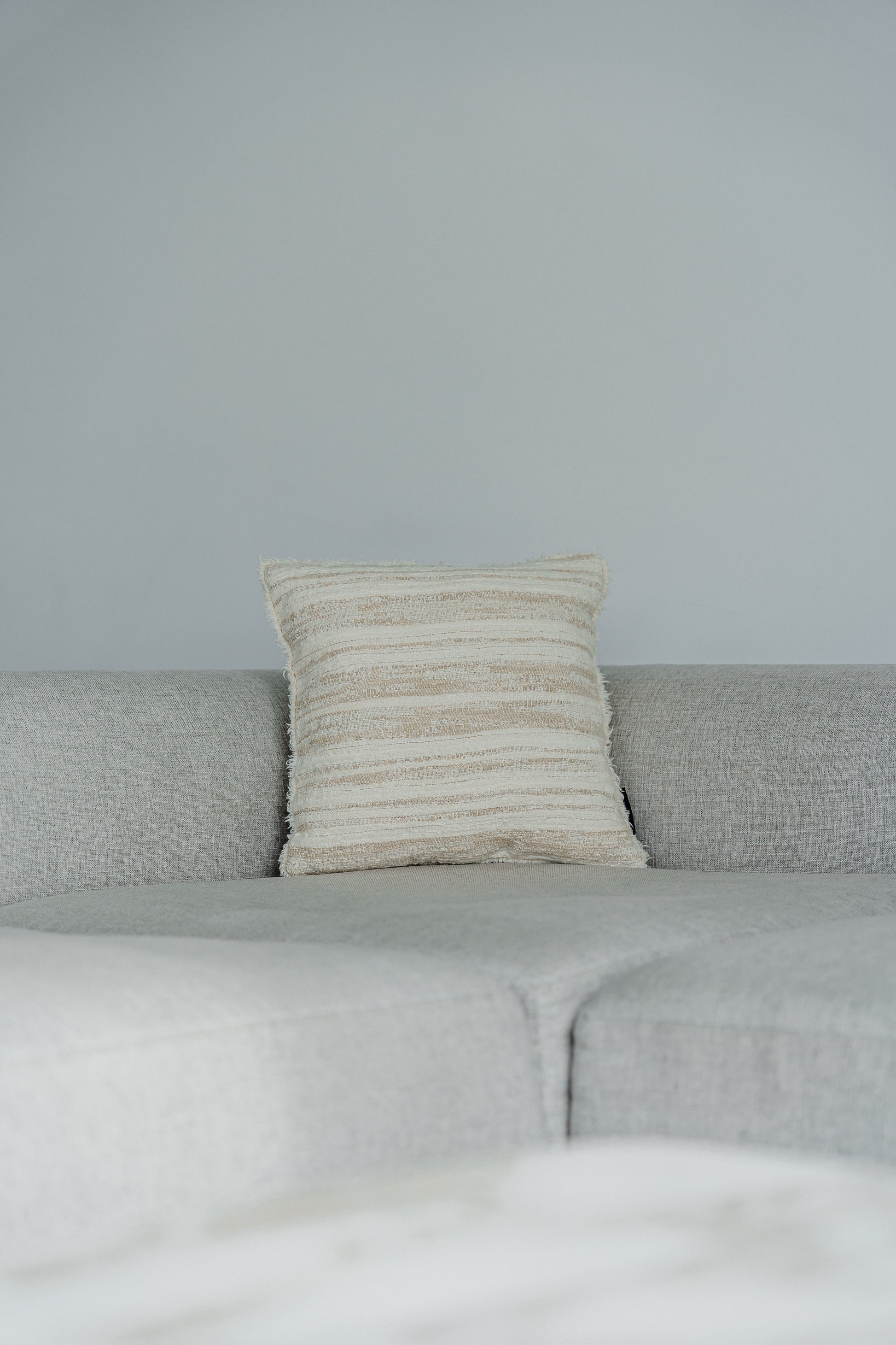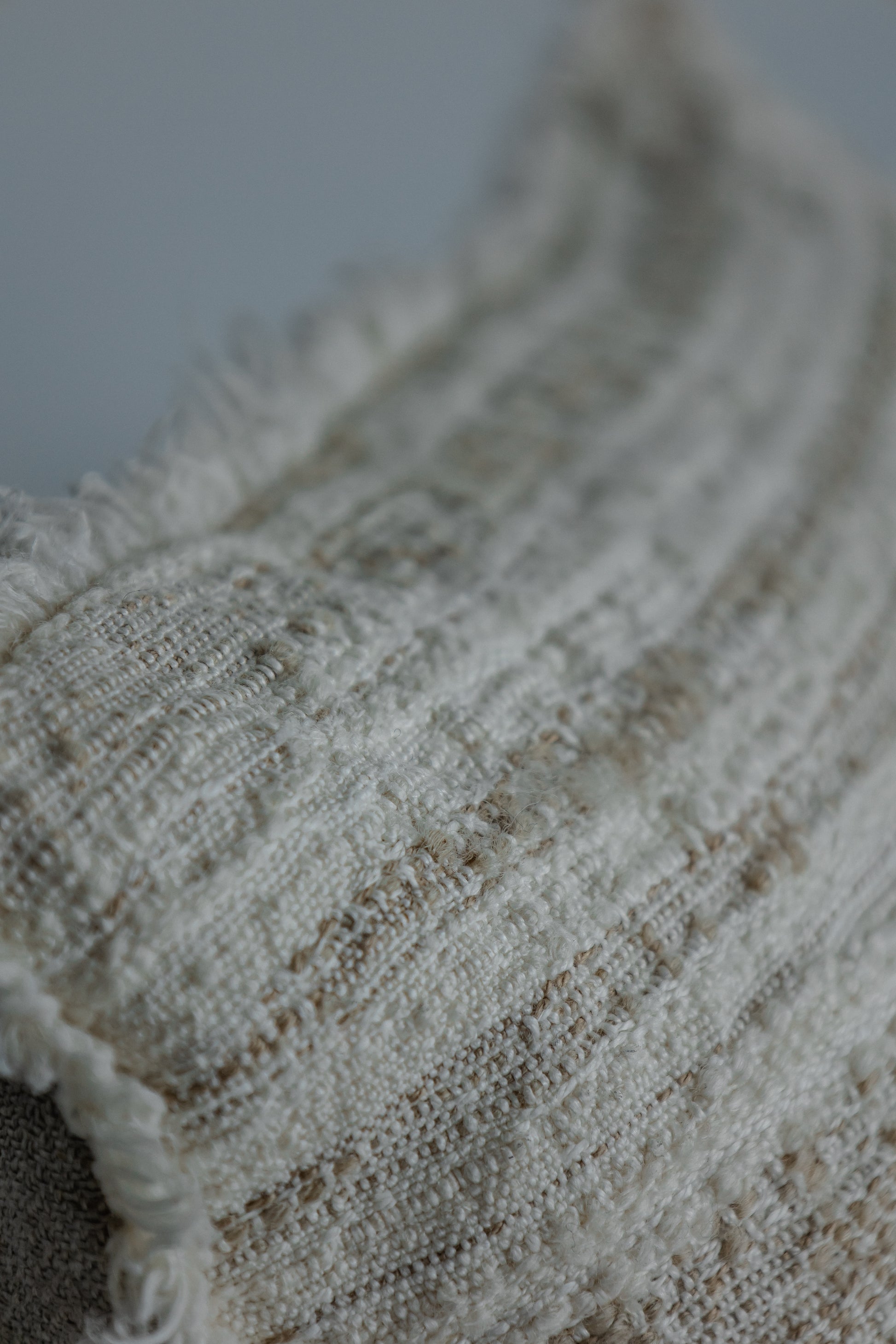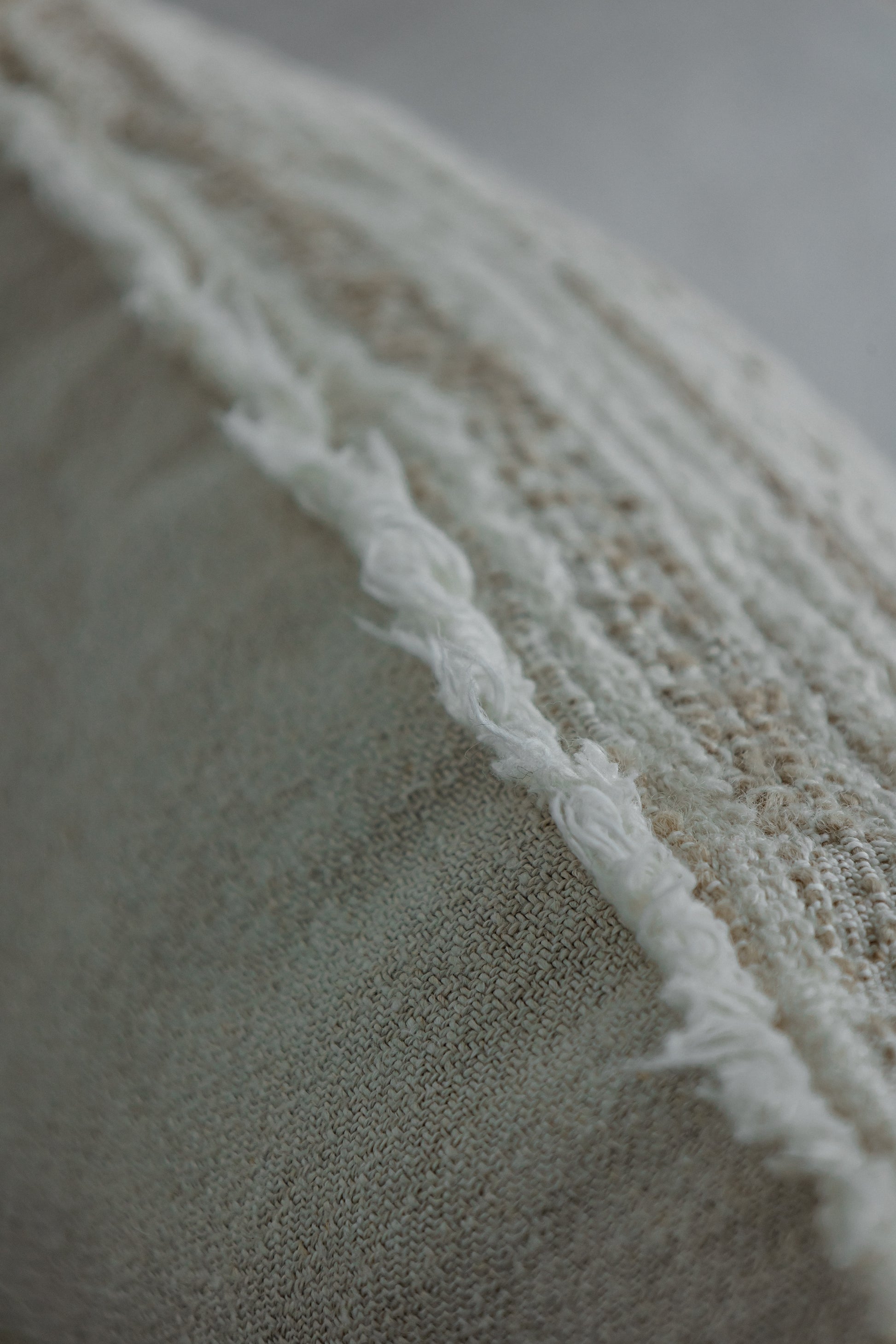 Gefertigt aus einem feinen Wolle-Leinen-Mix, vereint es natürliche Textur und luxuriöse Handarbeit. Die sanften, horizontalen Streifen in Natur- und Sandtönen verleihen dem Kissen eine ruhige, mediterrane Ästhetik – perfekt für zeitlose Interieurs und stilvolle Outdoor-Lounges.