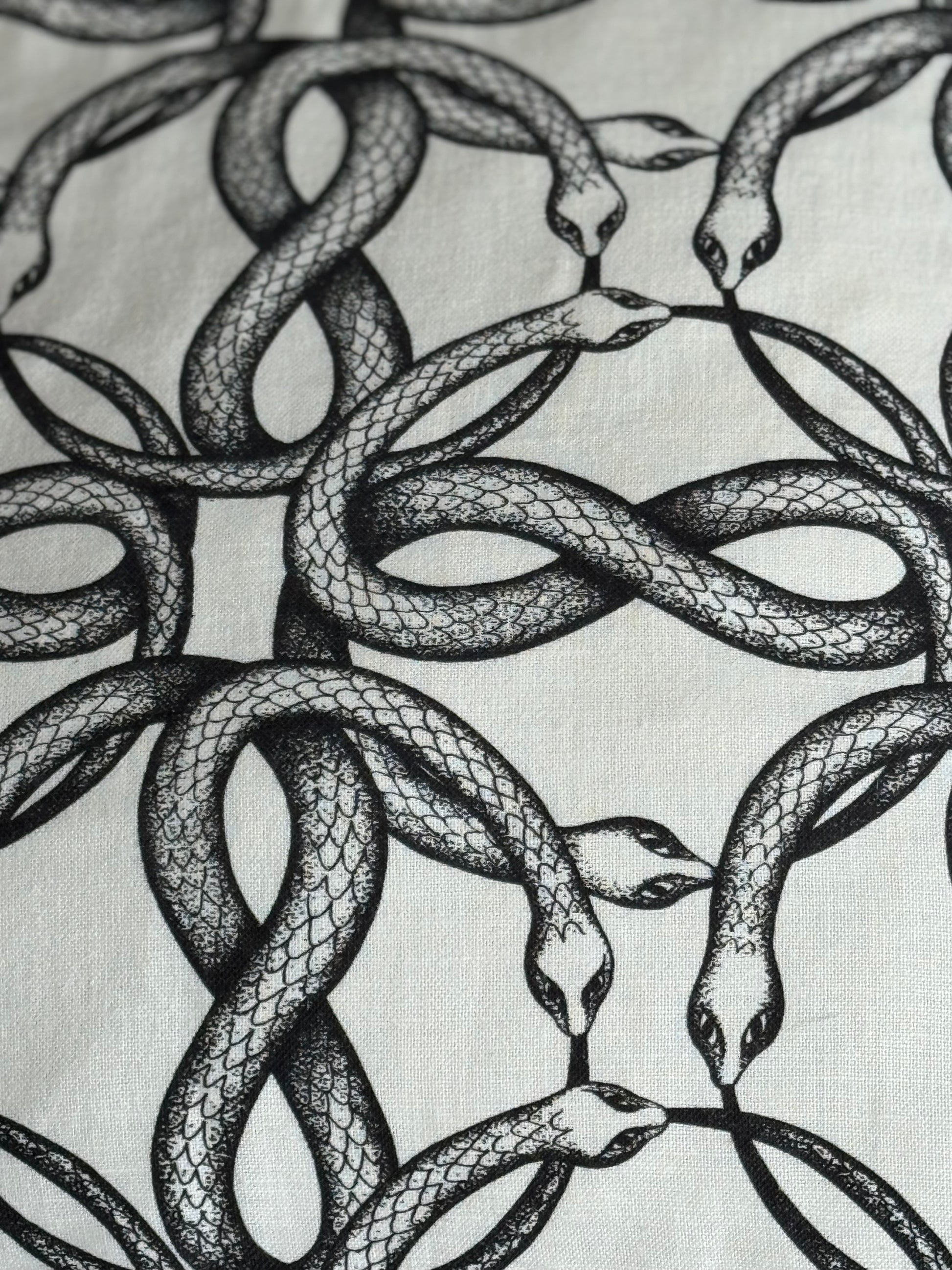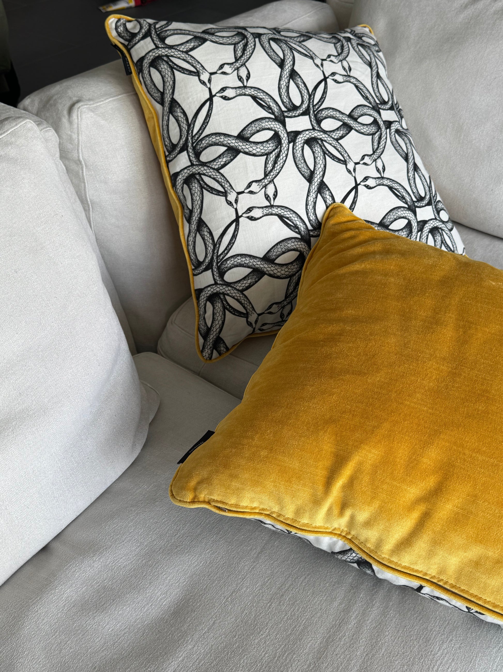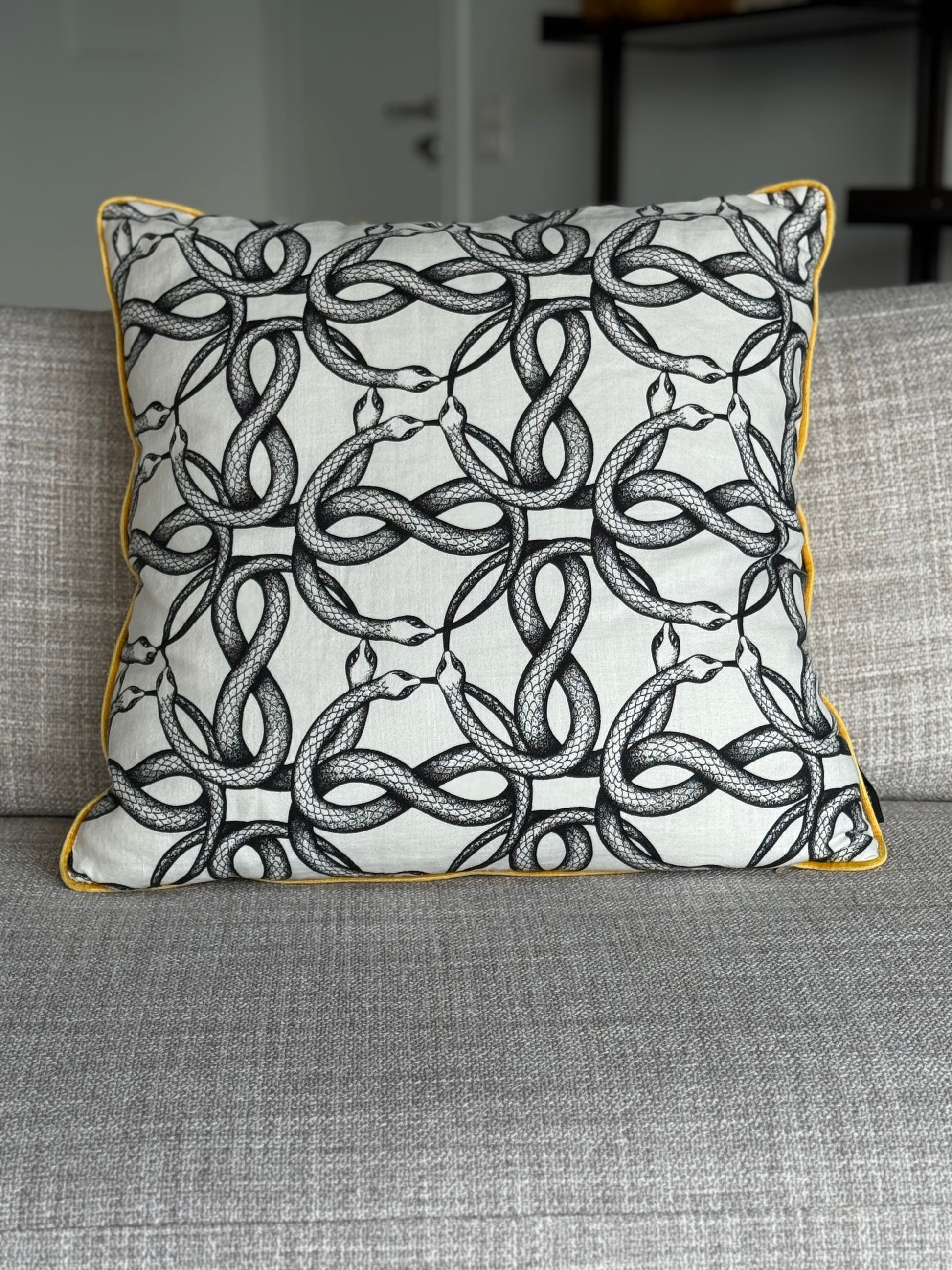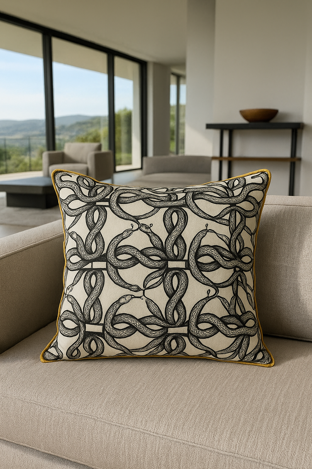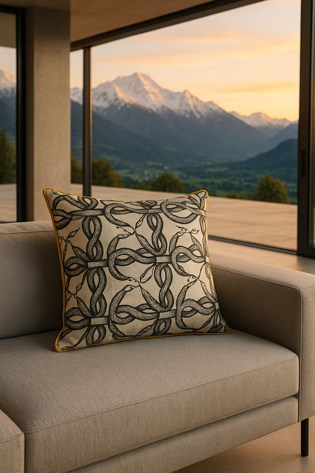 Gefertigt aus hochwertigem, bedrucktem Leinen des französischen Traditionshauses Pierre Frey Paris, zeigt das “Serpente”-Kissen ein faszinierendes Motiv ineinander verschlungener Schlangen – ein Symbol für Eleganz, Kraft und Ewigkeit.